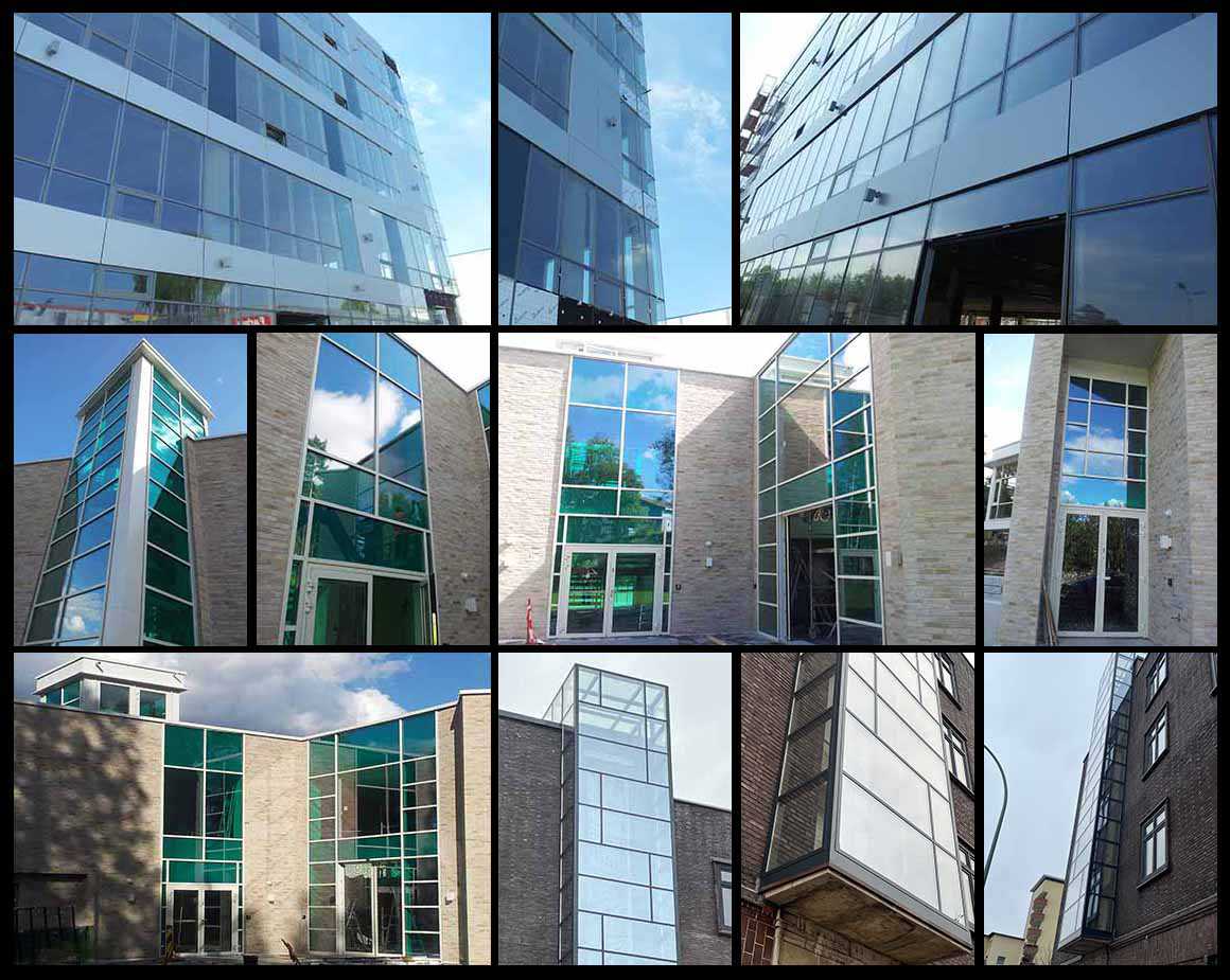 Glasspaneler montert på bærekonstruksjon i form av aluminium ramme, paneler festes med aluminiumsprofiler, gummi band for isolering