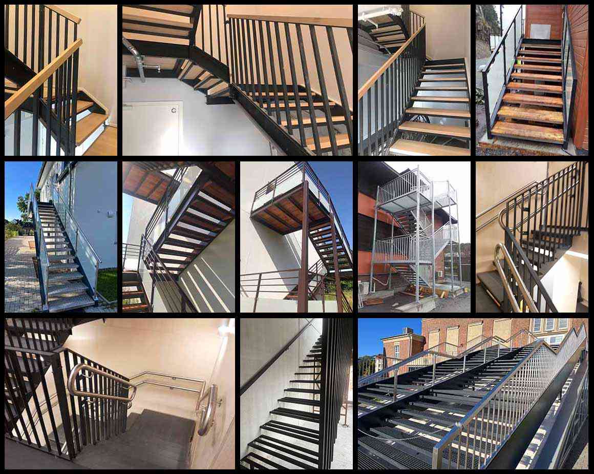 Trapper med konstruksjon av stålprofiler, trinn og landinger av treplanker/ gitter rister/ stålplater og glassrekkverk/ stålrekkverk